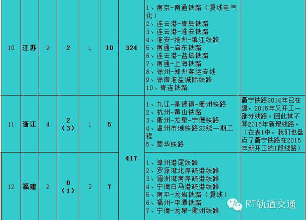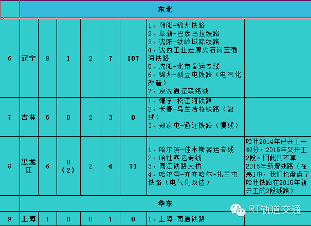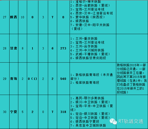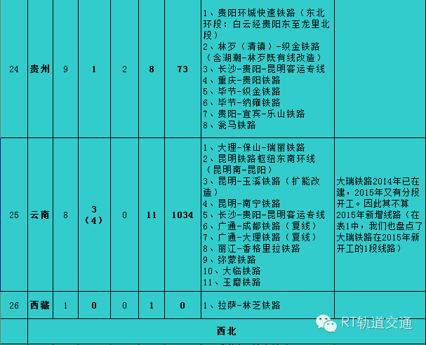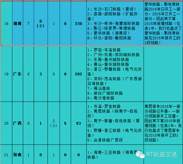 12月30日,中國鐵路總公司(以下簡稱中鐵總)宣布今年全國鐵路完成固定資產(chǎn)投資8200億元,投產(chǎn)新線9000多公里,新開工61個項目,全面完成了“兩個8000以上”的目標,實現(xiàn)圓滿收官。 今日,RT軌道交通官方微信特梳理匯總2015年全國新開工鐵路運營里程長度,以饗讀者,數(shù)據(jù)來源于網(wǎng)絡(luò),如有錯失,歡迎批評指正! 據(jù)RT《軌道交通》雜志統(tǒng)計,如圖1所示,2015新開工項目61個,新開工鐵路43條,新增投產(chǎn)新線里程9430公里。其中全線開工的有30條(圖中線路性質(zhì)為“開工”的是全線開工鐵路),分段開工的13條。新開工高鐵19條,新投產(chǎn)高鐵里程4693公里(其中全線開工的有12條,分段開工的有7條);新開工快速鐵路(即客車設(shè)計開行時速160-250公里的動車型鐵路)7條,新投產(chǎn)快速鐵路里程1079公里(其中全線開工的有5條,分段開工的有2條);新開工普速鐵路16條,新投產(chǎn)普速鐵路里程2686公里(其中全線開工的有13條,分段開工的有3條);新開工重載鐵路1條,新投產(chǎn)載鐵路里程972公里。 據(jù)RT《軌道交通》雜志統(tǒng)計,2015年12月內(nèi)大量鐵路集中開工,總共有22條,占全年開工鐵路總數(shù)的51.2%。其中,2015年12月26日當天新開工鐵路數(shù)量最多,同時有4條鐵路開工,分別為:鄭萬高鐵重慶段、銀西鐵路寧夏段、重慶鐵路樞紐東環(huán)線、南沙港鐵路。2015年12月25日當天也同時有3條鐵路開工,分別為:京沈通遼聯(lián)絡(luò)線、川南城際鐵路、合安高鐵。 (注:12月30日,中國鐵路總公司(以下簡稱中鐵總)宣布今年全國鐵路完成固定資產(chǎn)投資8200億元,投產(chǎn)新線9000多公里,新開工61個項目,全面完成了“兩個8000以上”的目標,實現(xiàn)圓滿收官。) 表1 2015年全國新開工線路長度統(tǒng)計表 據(jù)RT《軌道交通》雜志統(tǒng)計,如圖2所示,除吉林、上海、海南、西藏、陜西5個?。ㄊ校┮酝?,余下的26個省市在2015年都有新線開工。其中華北地區(qū)新投產(chǎn)鐵路里程857公里,東北地區(qū)新投產(chǎn)鐵路里程178公里,華東地區(qū)新投產(chǎn)鐵路里程2782公里,中南地區(qū)新投產(chǎn)鐵路里程2084公里,西南地區(qū)新投產(chǎn)鐵路里程1835公里,西北地區(qū)新投產(chǎn)鐵路里程1692公里。 表2 2015年全國已開工/在建鐵路統(tǒng)計表 據(jù)RT《軌道交通》雜志統(tǒng)計,2015年在建鐵路(包括2015年新開工的鐵路和2015年已在建的鐵路)總共150條。具體詳表3。 表3 2015年全國在建鐵路列表 |